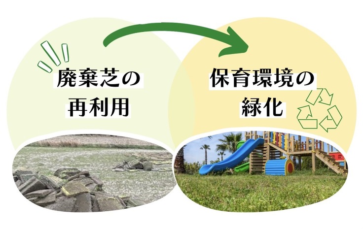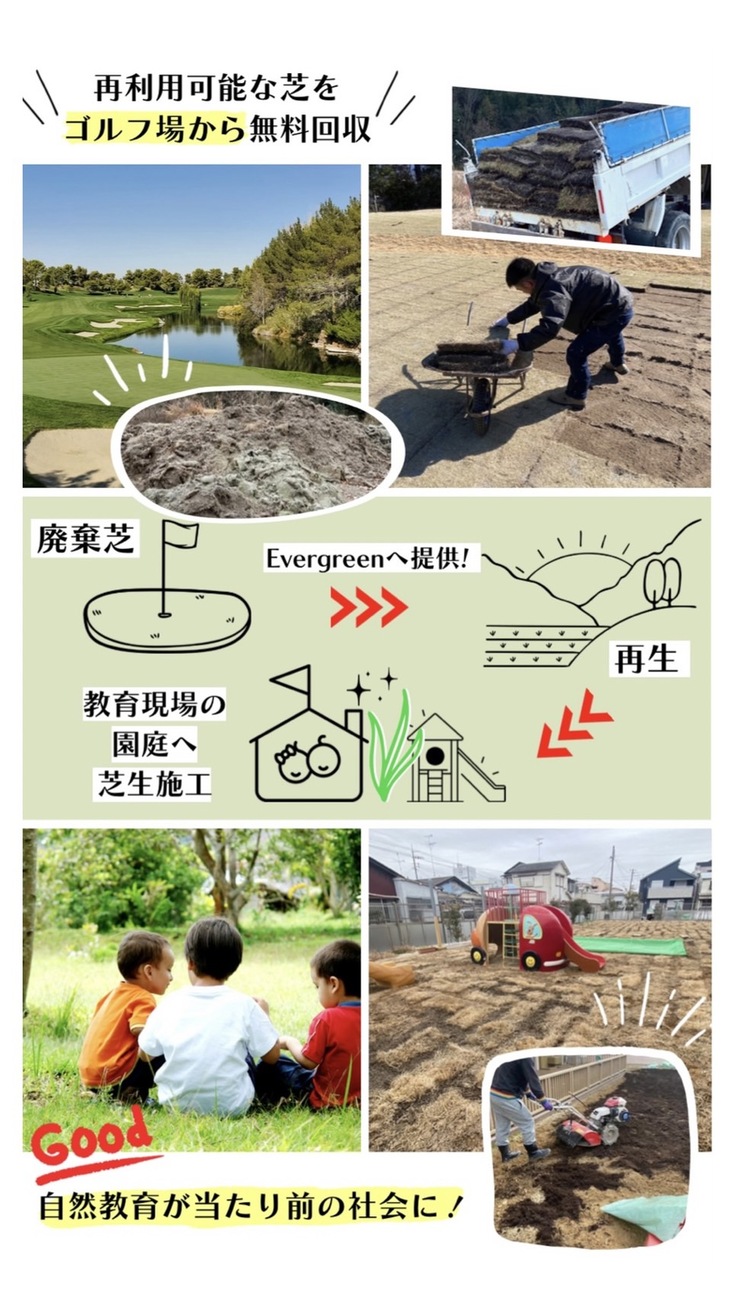 天然芝の園庭にすることで、子どもたちの【教育】【健康】、又地域の【環境】に良い影響があり、地域環境問題のカーボンニュートラルの社会を目指す循環型緑化を実行していきます。
