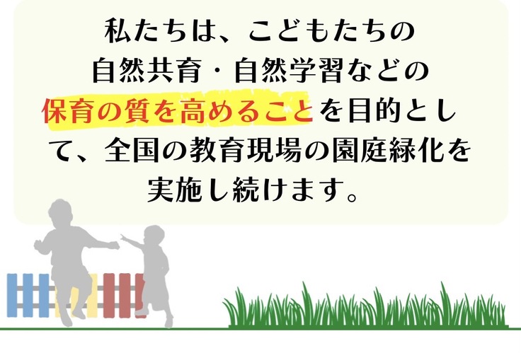 私たちは、“緑で繋がるこころの笑顔” をモットーに、まずは教育現場の園庭から、社会や家に笑顔と癒しの空間を作り、こどもが大人になる頃には ”緑のある生活が当たり前の社会” を創ることが私たちの使命だと感じています。