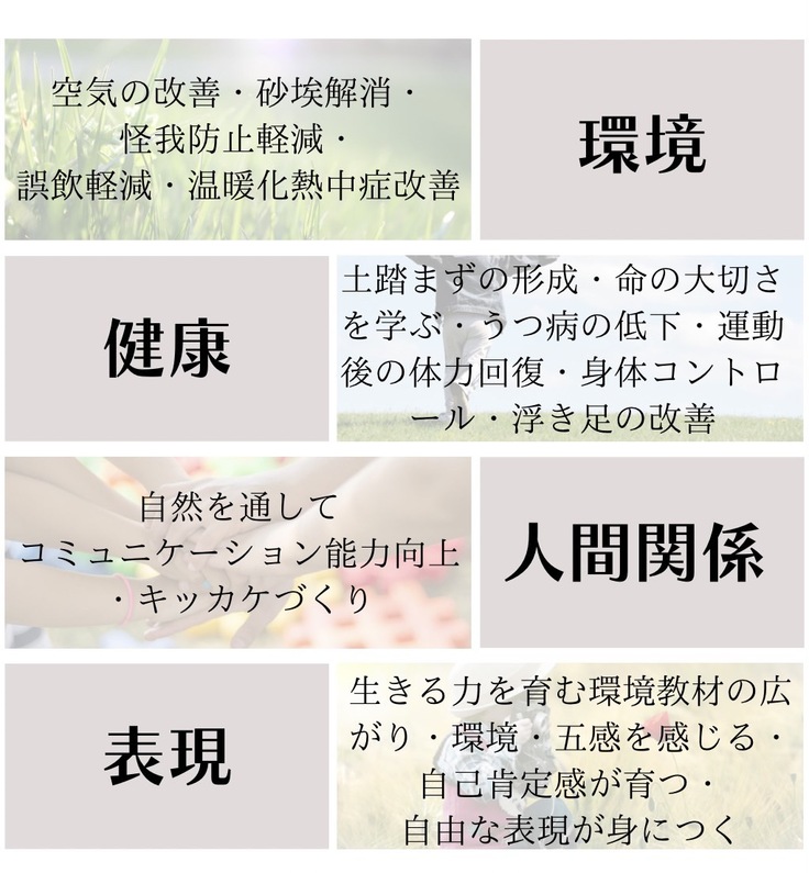 乳幼児期は人格形成の基礎となる大切な時期であることが幅広く認知されてますが、近年も保育の質の重要性についての認識が強まっています。五感を感じることができる緑化環境が減ることで、保育現場では怪我の増加や熱中症、運動能力の低下(浮指の増加・土踏まずの形成が遅れる)、心身の不安定化・発想力の低下、そしてコミュニケーション環境の縮小化などが挙げられます。更に近年のコロナ禍で、これまで出かけていた遠足や園外保育活動の減少が進み、改めていつも過ごす自園の環境の大切さや、園庭でできる事(遊びの幅)の見直しが必要となっています。