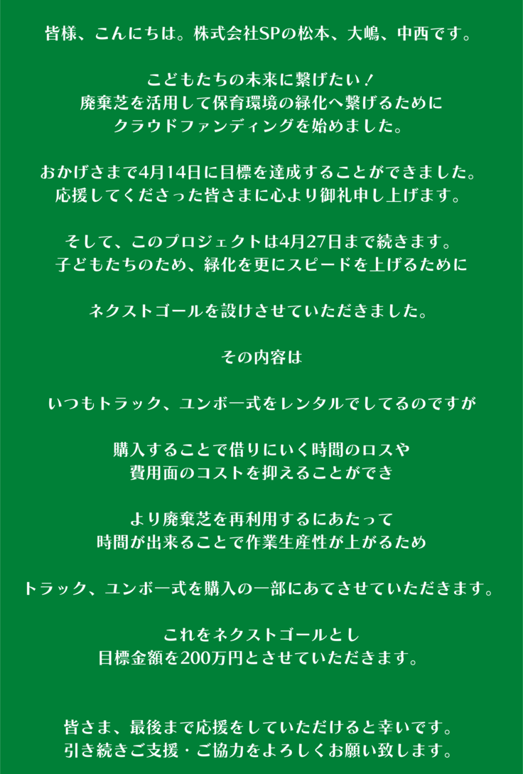 株式会社SPが全国の保育、幼稚園の教育現場を芝生施工する為に必要な再敷設費用の工事仕様機械(芝刈り機など)購入にかかる諸経費の一部を資金に使用します。