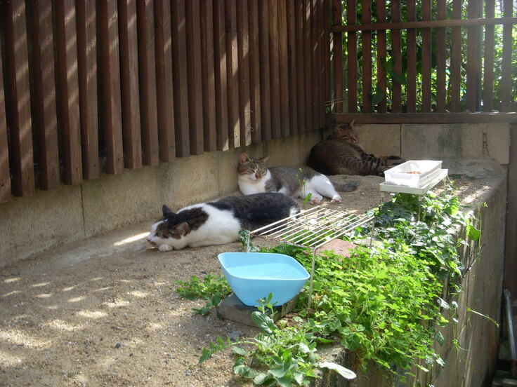 暑いから部屋にくればいいものを なぜか裏庭で過ごす愛猫達