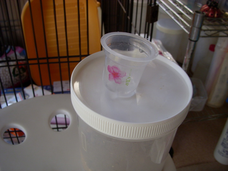 ハトは 飲水するのに ストローのように自力で吸うので このカップに水を入れて差し出すと