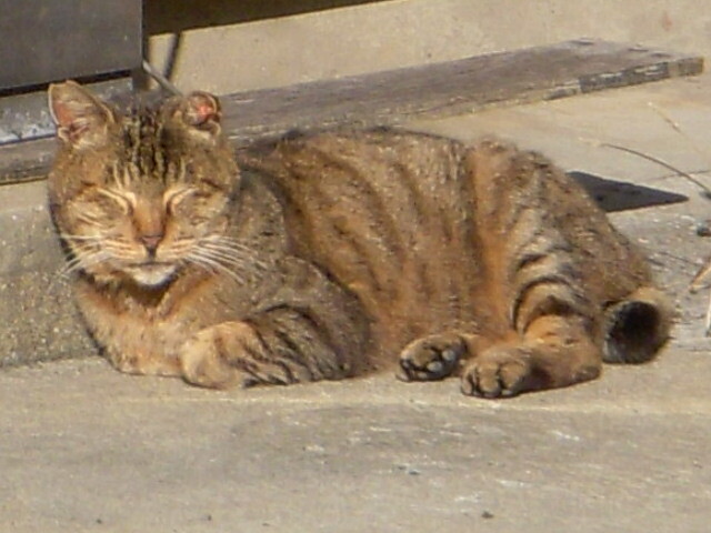 向かいの家の前で 日向ぼっこする キジ猫さん(片方、耳血腫)