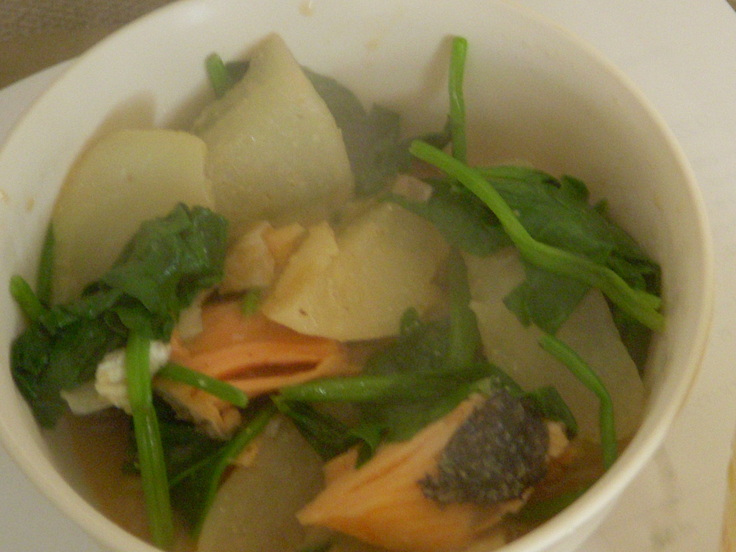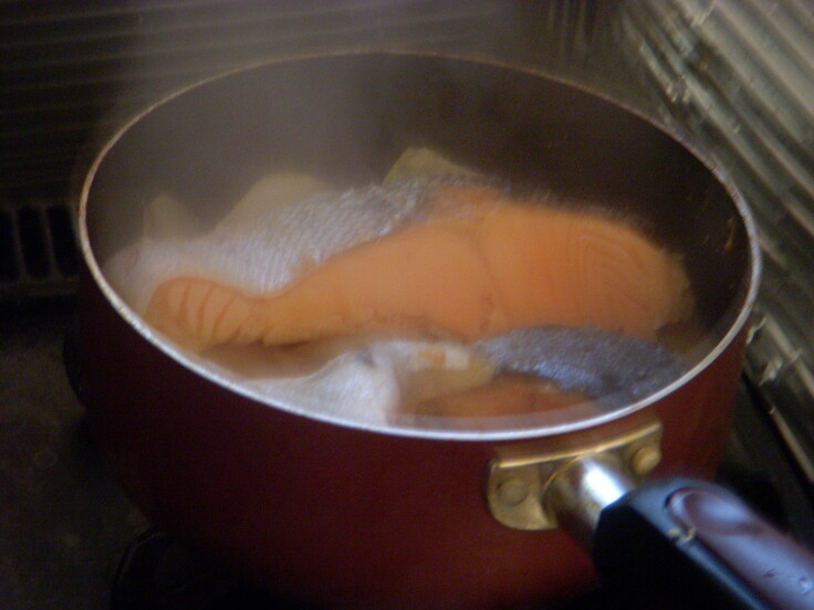 支援物資で戴いた鮭があるから これを味噌で煮込めば!!!