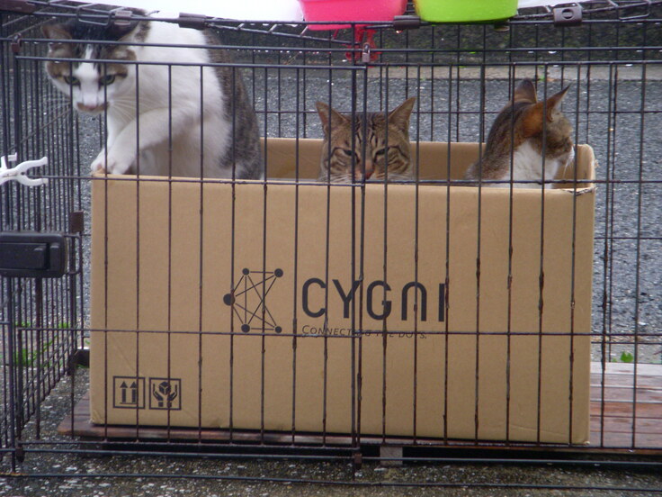 簀の子が濡れてるので段ボールに入ってもらってのアウトドア ツアー(屋外見学)です