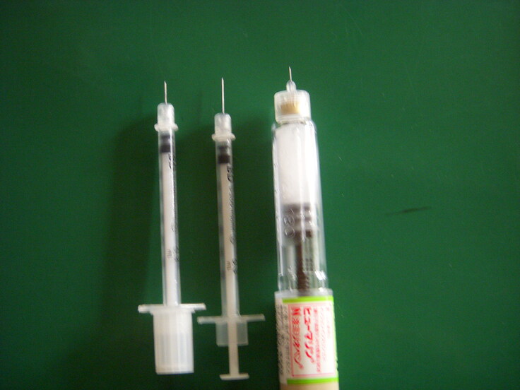 筋肉注射に近い状態はマズイ!と ヒューマリンミリオペンを買った(スタンプするように打てるというので)が、片手で一瞬で打つのは長さがあり、やりづらく、針も弱く 曲がる・・・