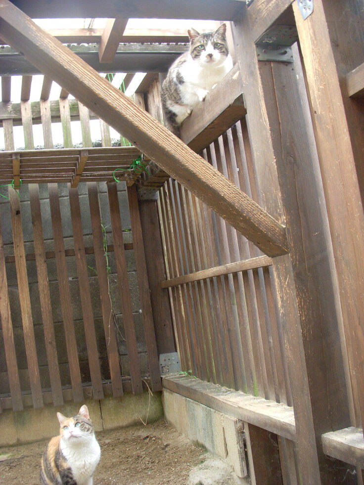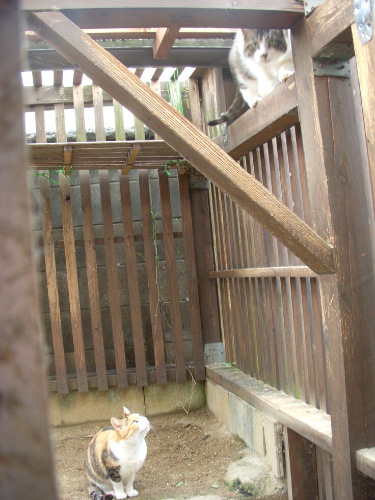 ガタイのいい 家庭内ノラのムーさんが 下にいる最強猫 ミケミケどんどんを怖れて 降りられないの図!! です