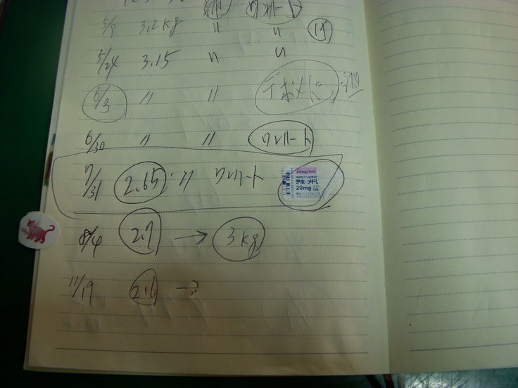 補液(強肝剤・ビタミン・糖など添加)、耳洗浄、点眼、爪切り、レボリューション、抗生剤入り給餌など処置して3kgになりました