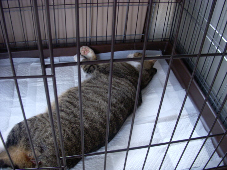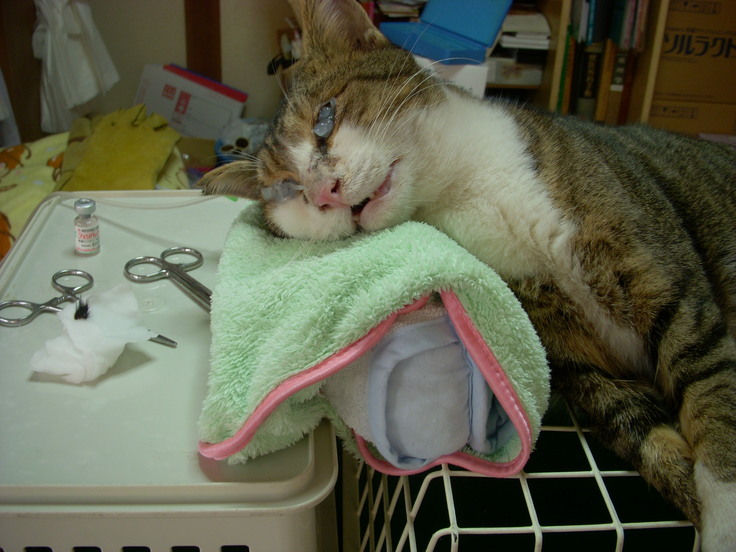 捕獲でき、手術を終えて 耳カット・ワクチン・補液などしてるところ