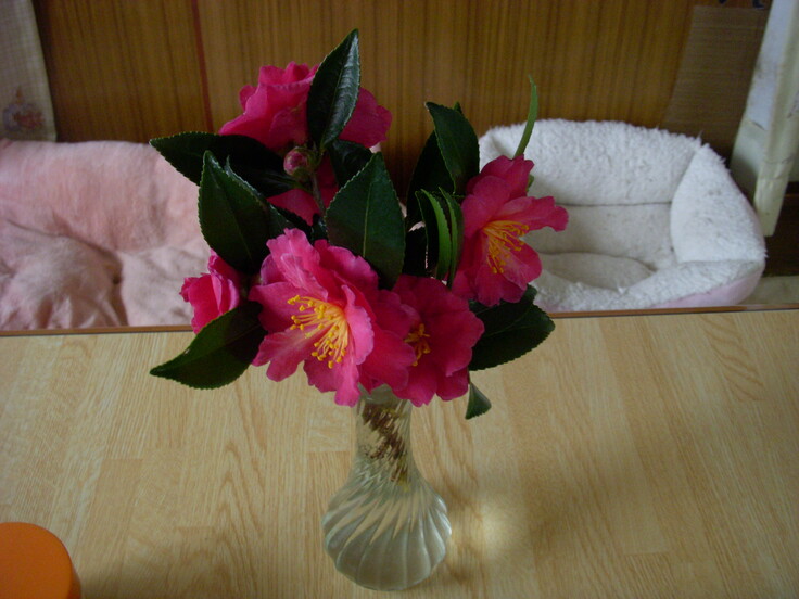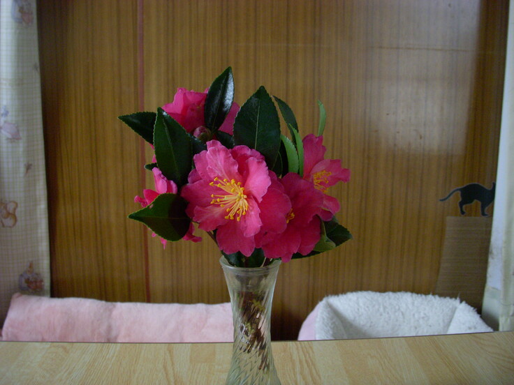 お花は往診先からギってきた山茶花があるので これに正月ピック(100均 これも何年も使ってる)を差して完了です