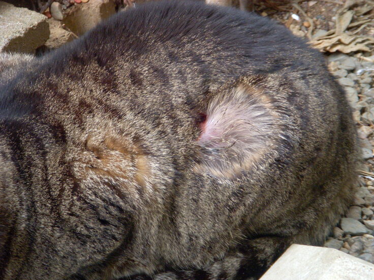 斜めだから 不明瞭ですが、怪我は大きい 広範囲に脱毛し 穴が3か所くらい開いとる