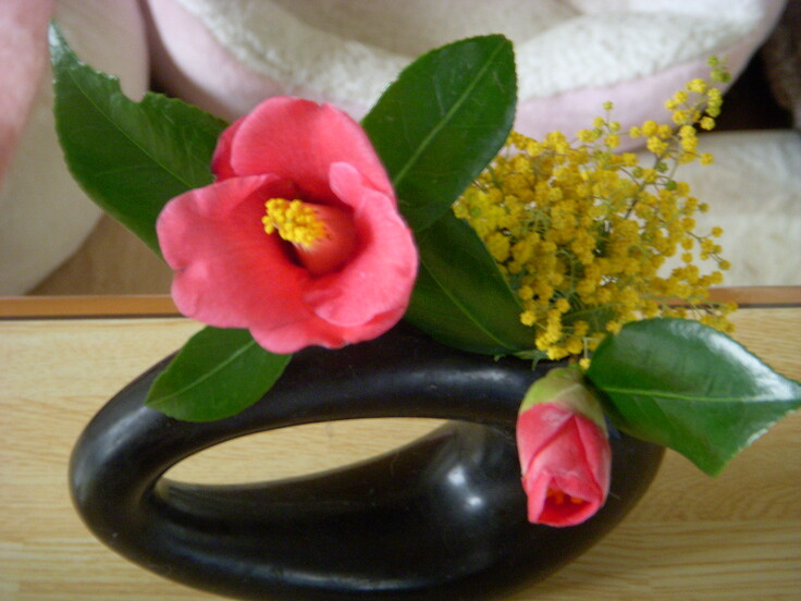 画像は マダムから頂いたミモザと往診先からギッてきた椿