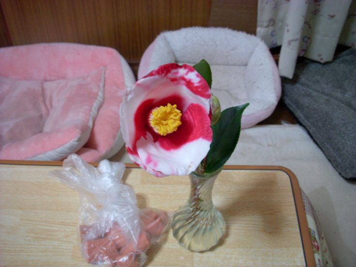 ビニル袋に入った 堅パンと往診先からギッてきた椿!!