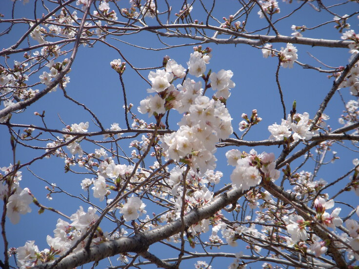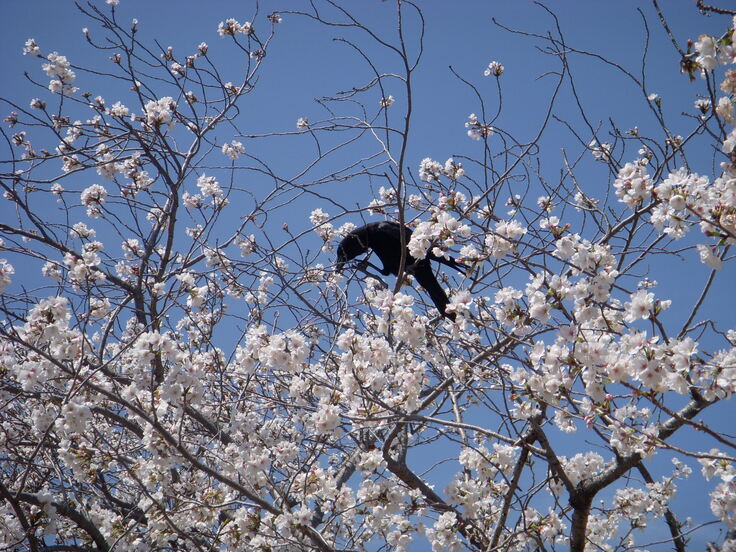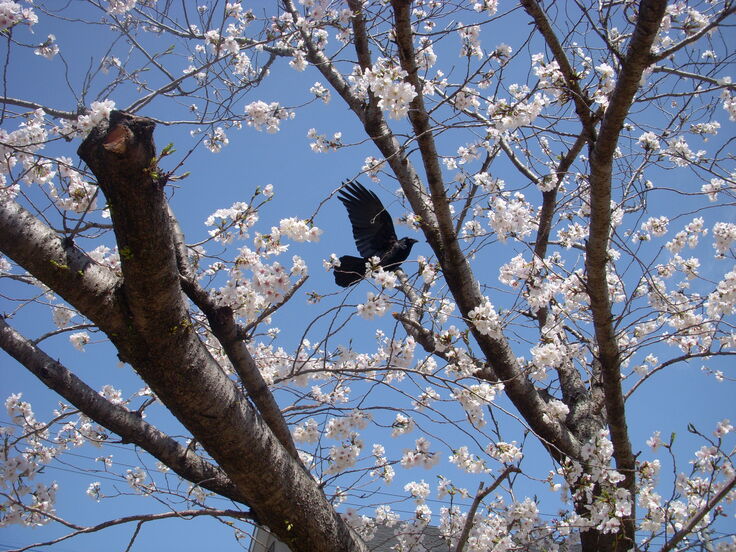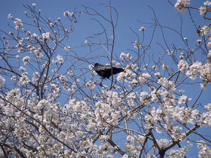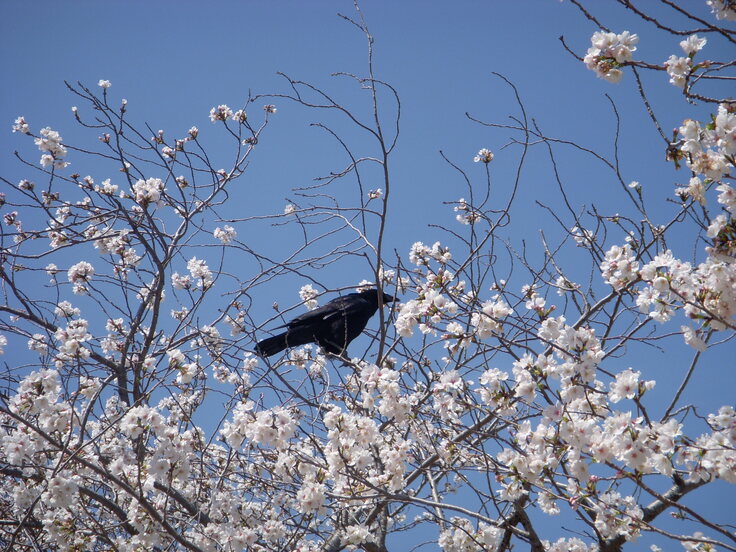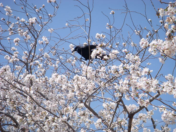 巣材を集めに来てたカラス 桜の枝を嘴で折って持って行ってました