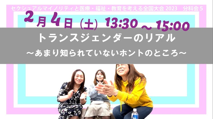この分科会では、「トランスジェンダー女性のリアル」をテーマに、SNS等で情報発信をされている、3名のトランスジェンダー女性に登壇していただきます。「トランスジェンダーのリアルを伝えること」、「性別移行について」、「トイレのリアル」、「中高年トランスの困難」、「医療現場でカムアウトできずに困ること」、「連帯」について、それぞれお話いただきます。