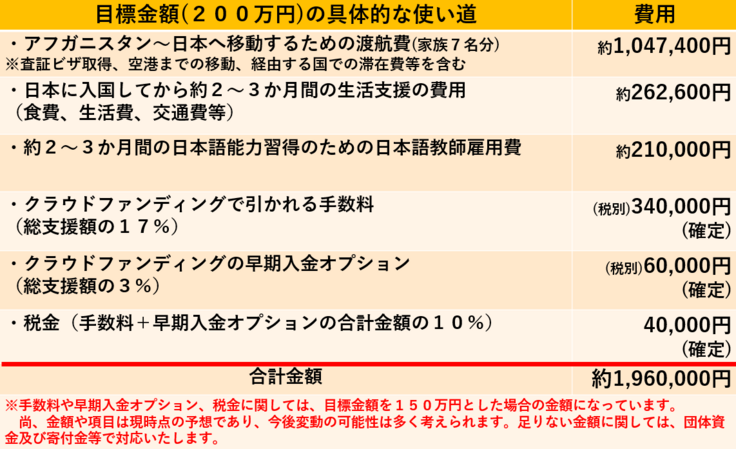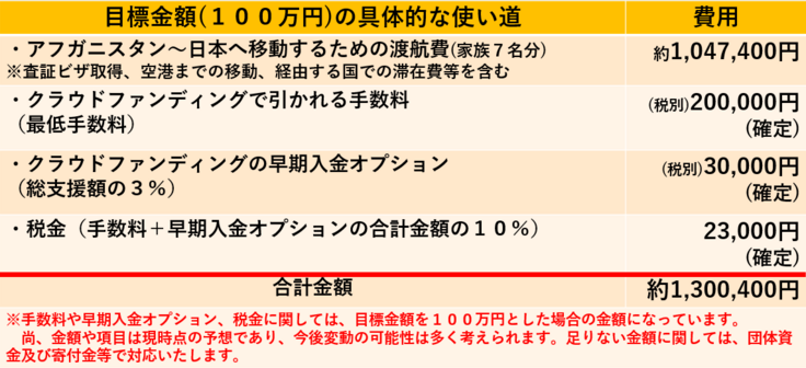 ※第1ゴールの目標金額は、アフガニスタン~日本~鹿児島までの渡航費用や、入国するまでにかかる滞在費用等を含めた金額で、最初の目標金額となります。金額や内容項目は現時点での予想であり、今後の変動も多く考えられますので、ご了承いただきますよう、よろしくお願いいたします。