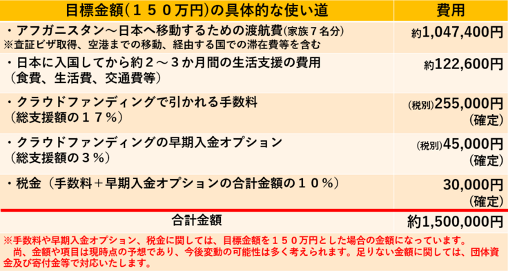 第1ゴールの100万円を集めることができた場合は、ご家族が日本入国後、仕事が始まるまでの約2~3か月間に必要な生活支援資金等に充てる費用を確保するために、第2ゴールを150万円に設定をする予定です。金額や内容項目は現時点での予想で、今後の変動も考えられますので、ご了承いただきますよう、よろしくお願いいたします。
