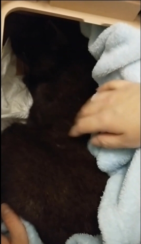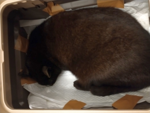 キャリーケースを準備してから寝床ボックスを開けてみると、アクオスは先ほどと変わらずにうずくまったまま口で呼吸をしている状態でした。