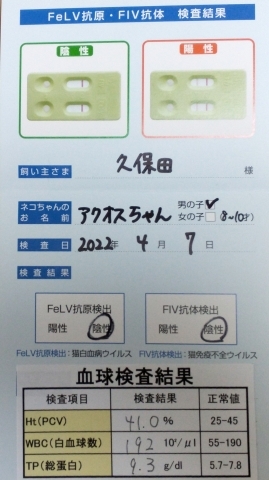 その結果、アクオスは猫エイズ・白血病ともに陰性でした。