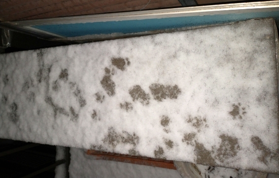 夜のお世話の時に何気なく2階のベランダを見たところ、積もった雪の上に動物の足跡が残っていたのです。