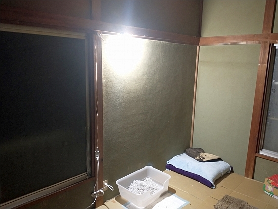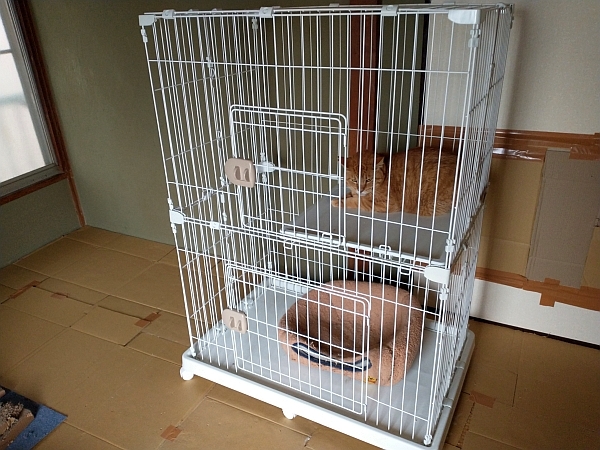 この部屋でも電気の修理の最中は、猫たちにはケージに入っててもらうことになりました。
