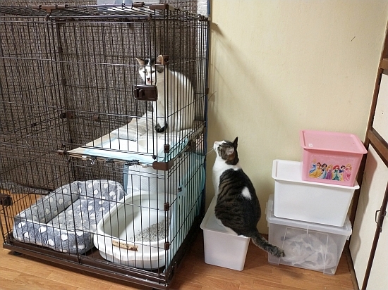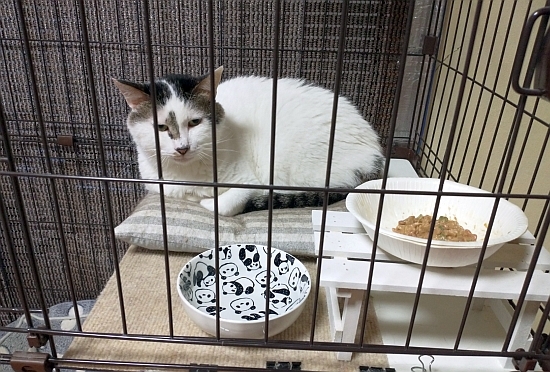 狭いケージ暮らしを強いてしまうのは可哀想でしたが、ケージの中なら他の猫に邪魔されることなく、口の調子が悪いスカーでも自分のペースでゆっくりと食事を摂ることができます。