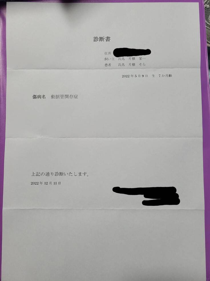 ですが引き取った後に心配で病院に連れていき、そこで動脈管下開存症(PDA)と診断されました。