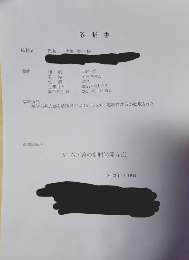 引き取る際に心雑音がある、でもそのままでも大丈夫とブリーダーさんから言われたので引き取りましたが実際このように皆様にご支援お願いするというかたちになってしまいました。