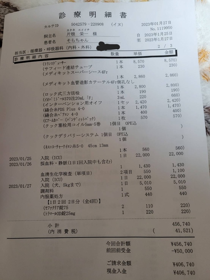 ▲手術費用の領収書です。