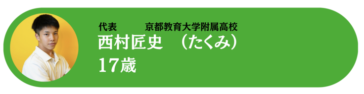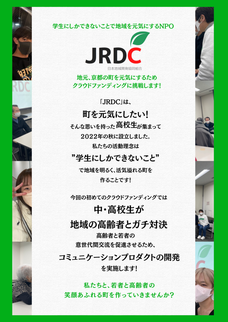 はじめまして。京都教育大学附属高等学校2年の西村匠史です。高校2年の夏に、地元の過疎化を解決したいという思いから『NPO法人Japan Regional Develop Cooperaion』略してJRDCを立ち上げました。法人の運営は西村をはじめ主に関西の学生が行っており、京都を中心に様々な地域を盛り上げていこうと考えています