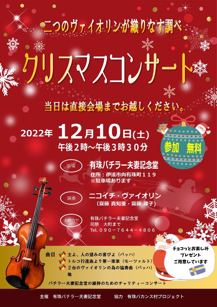 毎年、礼拝堂で行われるクリスマスコンサート。昨年は素晴らしいヴァイオリンの演奏を聴くことができました。