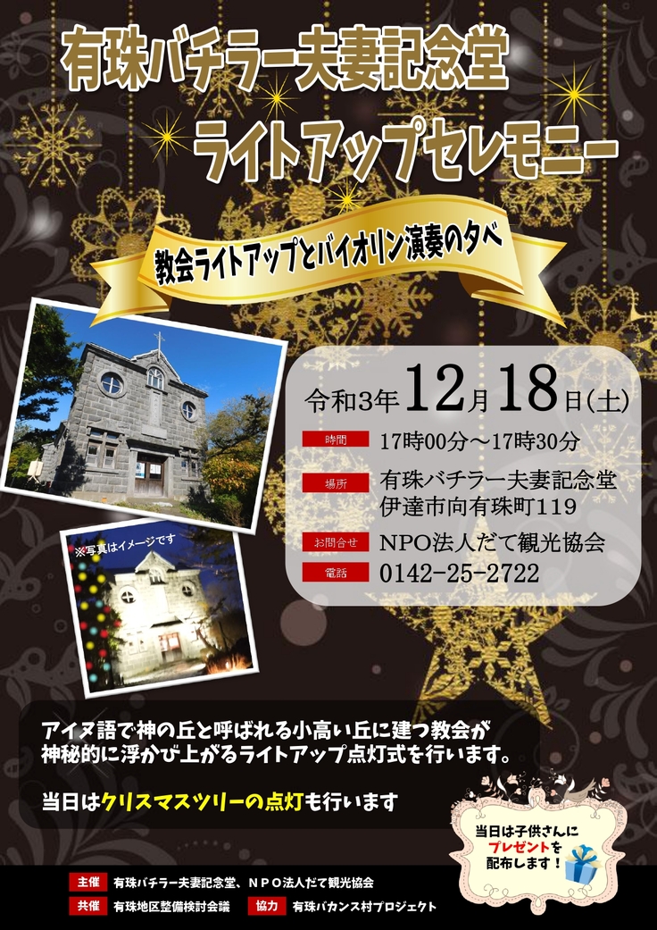 本年は自粛の影響もあり、あまり活動ができない年でしたが、長年提案していた有珠の教会のライトアップと華やかなセレモニーが行われた嬉しい年でした。
