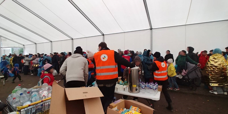 国境地帯でウクライナ避難民へ食糧や水を提供する様子