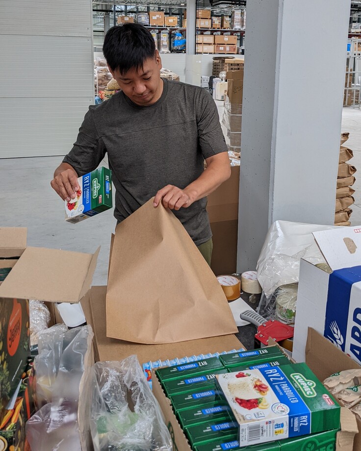 ポーランド国内の倉庫で作業をするウクライナ避難民。ウクライナ避難民がまだウクライナ国内に残る人々のためにフードパックのパッキング作業を行っている