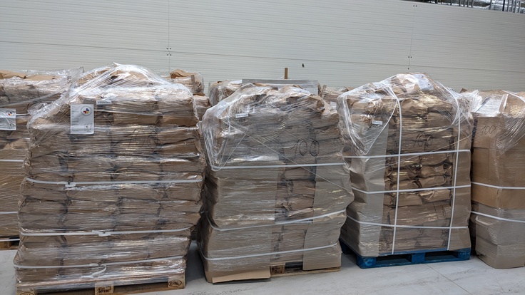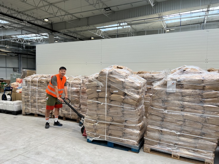 パッキングしたフードパックは、パレット上に積み上げて梱包し、週1回程度の頻度でウクライナ国内の拠点へ輸送する