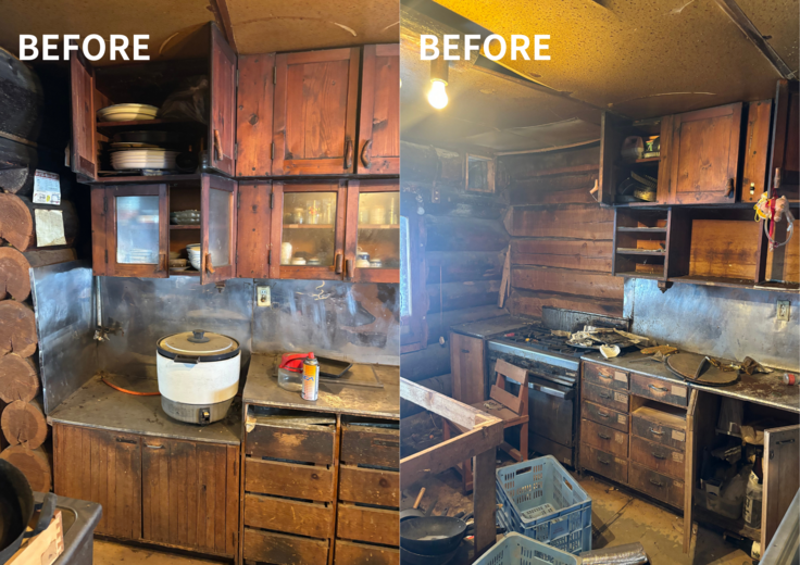 BEFORE写真、、、レストラン棟の厨房内の機器を全部出している途中の写真です。