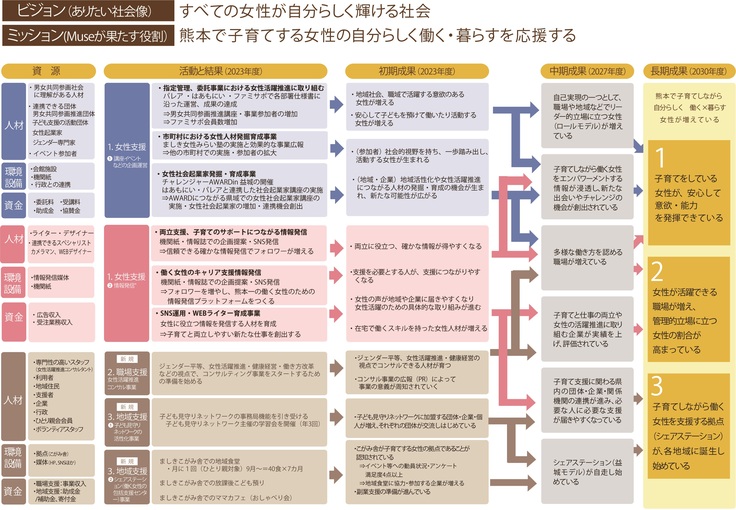 以下のロジックモデルは、母体であるミューズプランニングが、2030年を見据えて描いたものです。今回のウイメンズ・フォーラムくまもとの取り組みは、一番下段の茶色の部分に示しました。2030年には、私たちが取り組む「シェアステーション」が複数個所にも設置され、支援の輪が広がっていくことを目標に掲げ、2022年秋ごろから益城町での取り組みの準備を始めてきました。