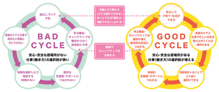 これまでの取り組みの中で見えてきた支援を必要とする女性の多くは、仕事(職場)のこと、子どものこと、夫婦のこと、自身の家族とのこと、自分の体調や将来のことなどの悩みを抱えながら、誰にどのように伝えればいいのか分からないという状況にありました。公的な相談窓口があるにも関わらず、悩みを抱えながら相談できない、解決の方法が分からないという行き詰まり感の中で、子育てや仕事、暮らしへの気力もゆとりも失われてしまうという、負の連鎖に陥っていると思われます。