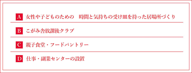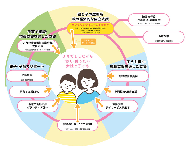 この負の連鎖を断ち切るためには、まずは女性や子どもが気軽に立ち寄れ、日々の慌ただしさからひと時でもほっとできる場所で、日ごろの小さな悩みや心のひっかかりを話すことができる『女性や子どものための時間と気持ちの受け皿を持った居場所』が必要だと考えました。そして必要な支援を必要な人につないでいき、ここに親の経済的自立に向けた支援や情報をプラスすることで、より根本的な支援につながると考えます。