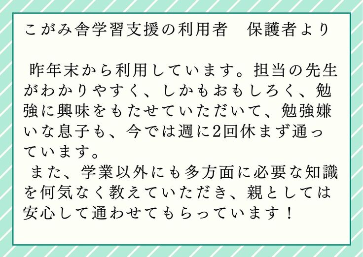 という手ごたえを感じています。子どもが安心して学習し、心身共に安定してくれば、必ずや親の精神的経済的負担の軽減にもつなげていけると考えます。また私たちが子どもを介して親とつながることで、相談や公的支援の窓口がより身近になると思います。