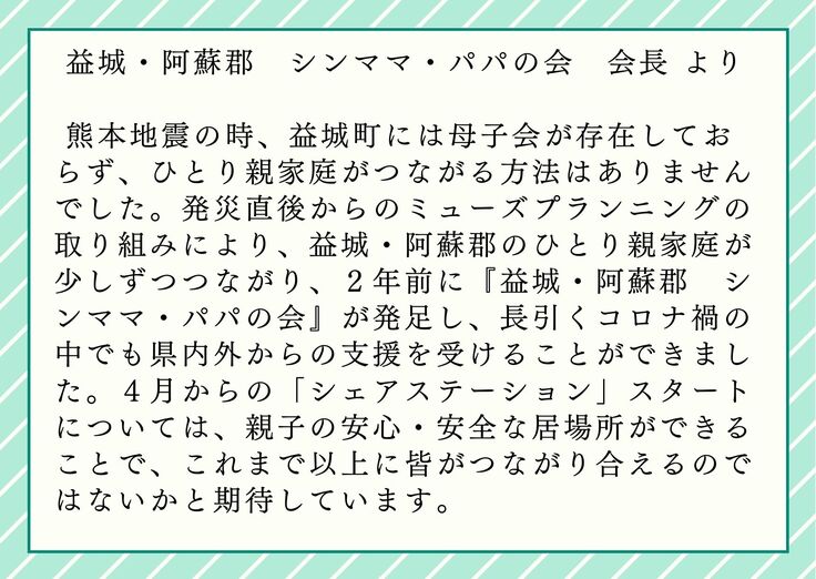 今回私たちは、創業25周年を機に新たな団体、「一般社団法人ウィメンズ・フォーラムくまもと」を立ち上げ、シェアステーション プロジェクトをスタートすることにしました。これは13年前にミューズプランニングとして企画しながらも実現には至らなかった『時間と気持ちの受け皿を持った女性と子どもの居場所』を熊本地震の被災地である益城町に設置し、必要な支援を必要な人につないでいくコミュニティサポートの拠点を創っていくものです。