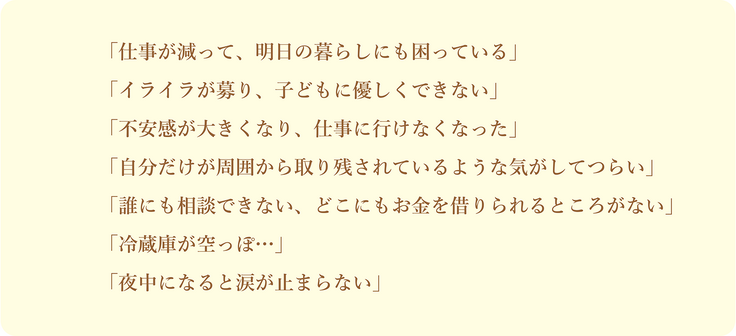 度重なる自然災害や長引くコロナ禍の中で、困窮していくひとり親世帯や、子育ての負担感を抱え追い詰められている女性たちの拠り所を創り孤立化を防ぐことを通して、誰一人取り残さない、誰もが自分らしく働き・暮らせる社会を目指します。