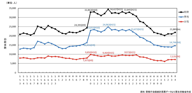 また、男性の自殺者数は、女性の約2.1倍となっている。