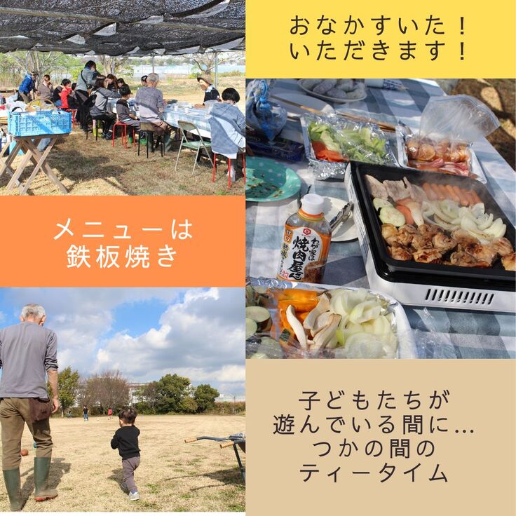 さて待ちに待った昼食は、農園にテーブルを置き、みんなで食卓を囲んで鉄板焼き!