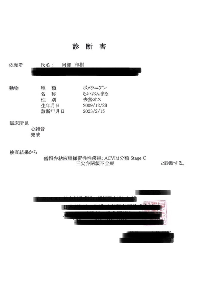 専門医の診察結果もやはり僧帽弁閉鎖不全症でステージ※はC(心不全の状態にいる)。余命としては平均半年~9ヶ月と言われました。