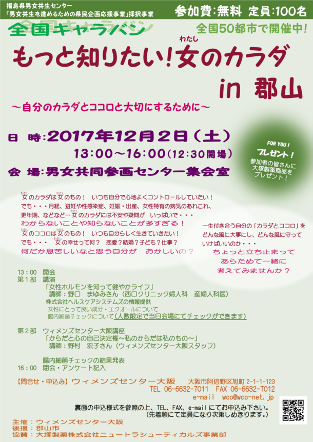 12月2日(土)に福島県郡山市で『もっと知りたい!女(わたし)のカラダ全国キャラバンin郡山~自分のココロとカラダを大切にするために~』が開催します!