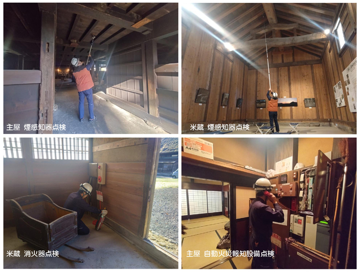 主屋、米蔵など各建物それぞれに設置している消火器や煙感知器、自動火災報知設備(主屋)の点検を(有)信栄防災 様より実施していただきました。