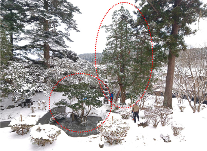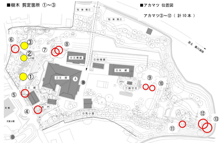 剪定箇所① モミジ        剪定箇所② イチイ(左)、剪定箇所③ イトヒバ(右)
