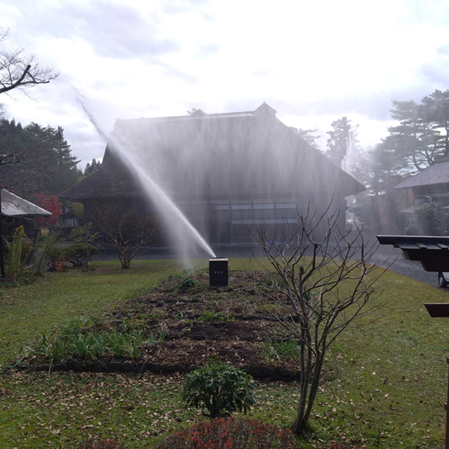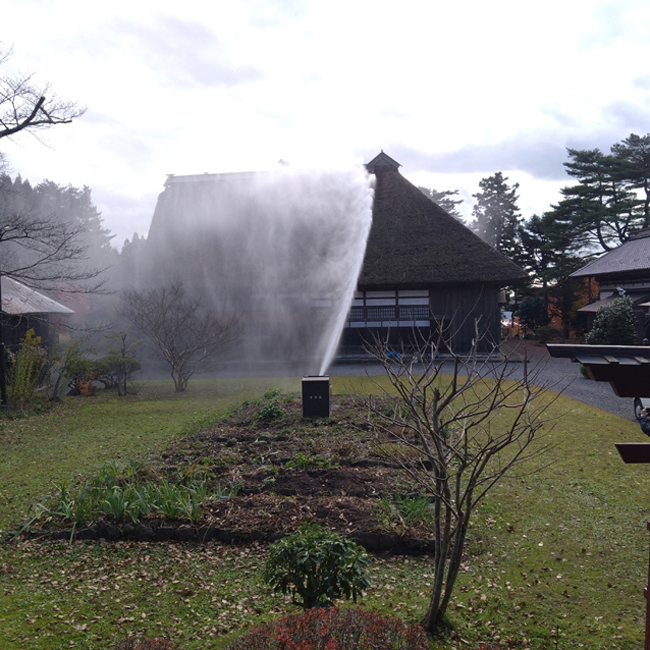 5基ある内2基が自動放水式となっており、その放水銃からは主屋の茅屋根を覆うように放水されます。写真は、中庭・花壇に設置されている一台からの様子です。