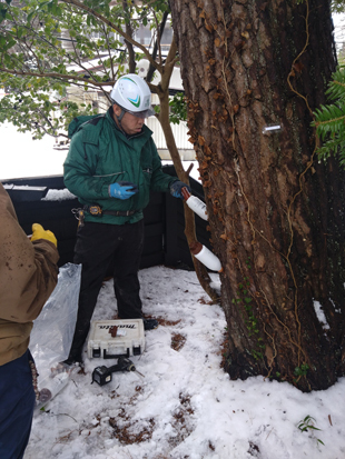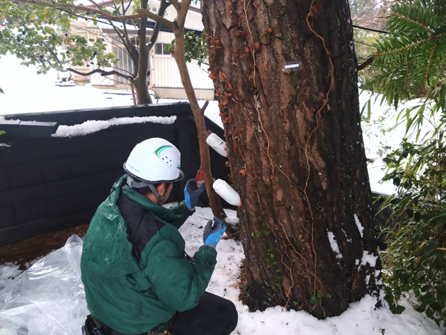 木の大きさに合わせて注入する薬剤量が決まっており、木の幹に小さな穴をあけ、そこに薬剤を注入していきます。